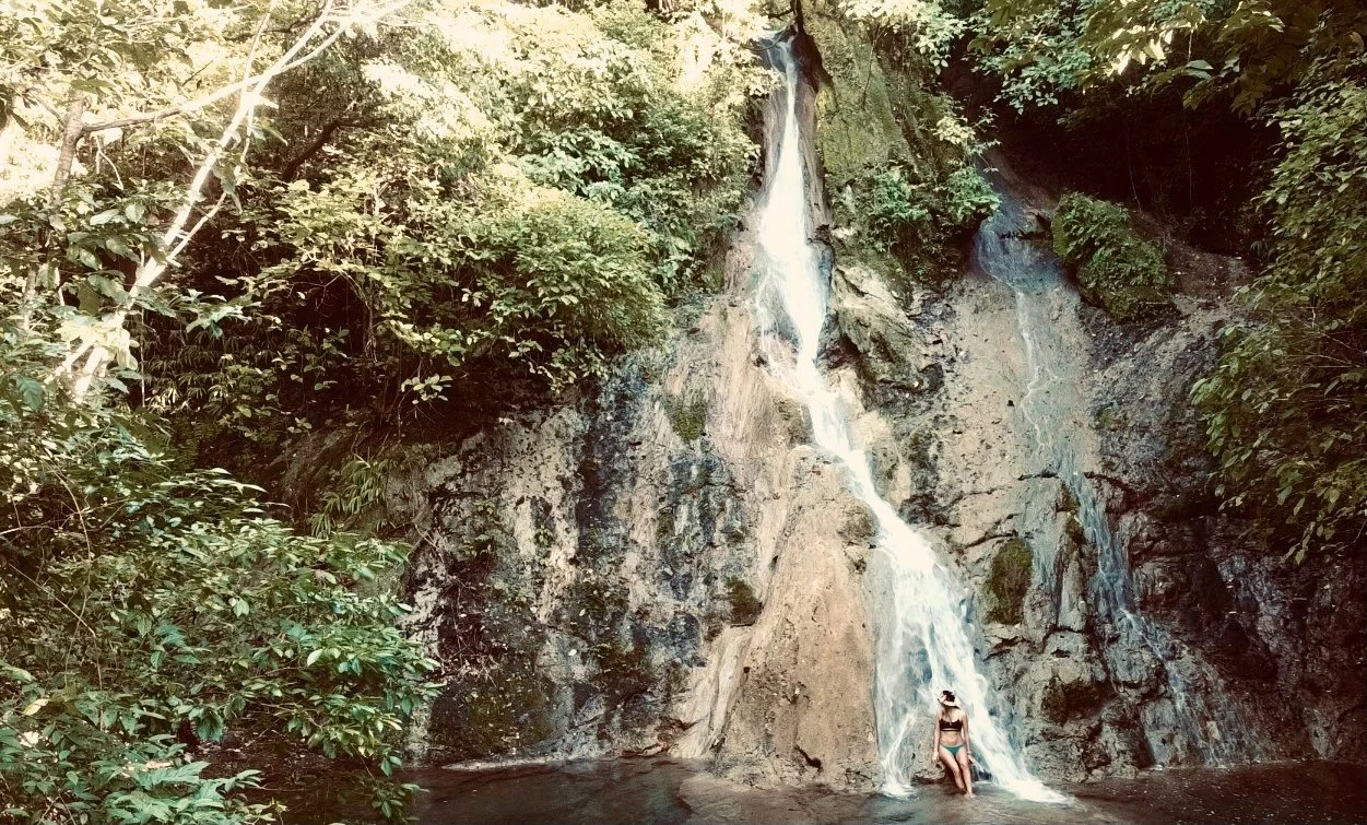 A person standing near a waterfall surrounded by lush greenery in a forest.
